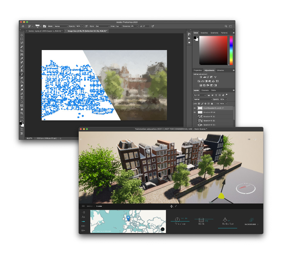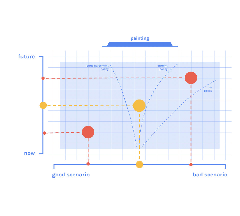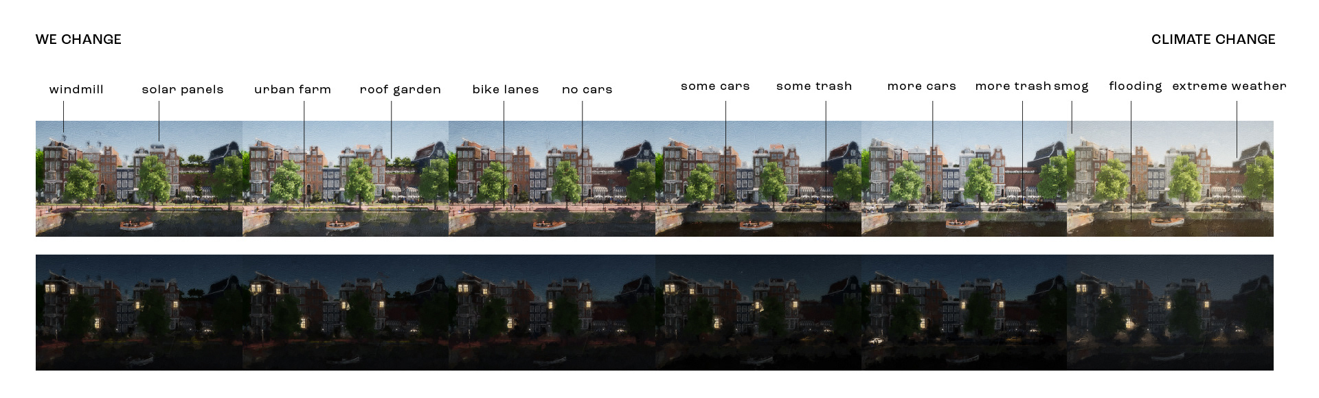 The idea is to have a painting of Amsterdam that can change its scene depending on real time weather. On top of that, when a user is present, it will show different future scenarios: either We Change, or Climate Change.